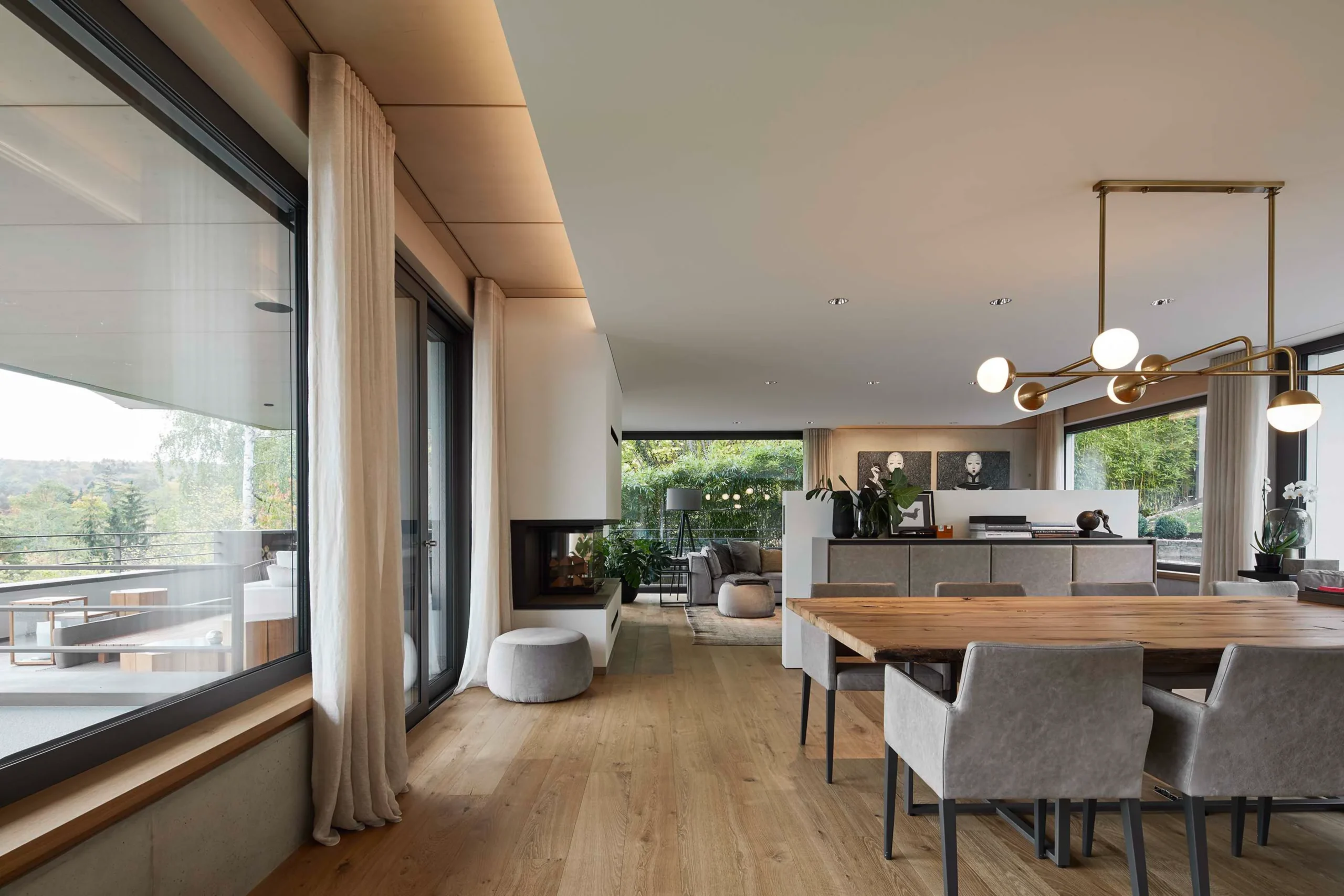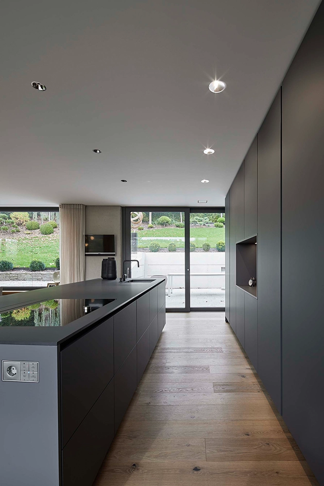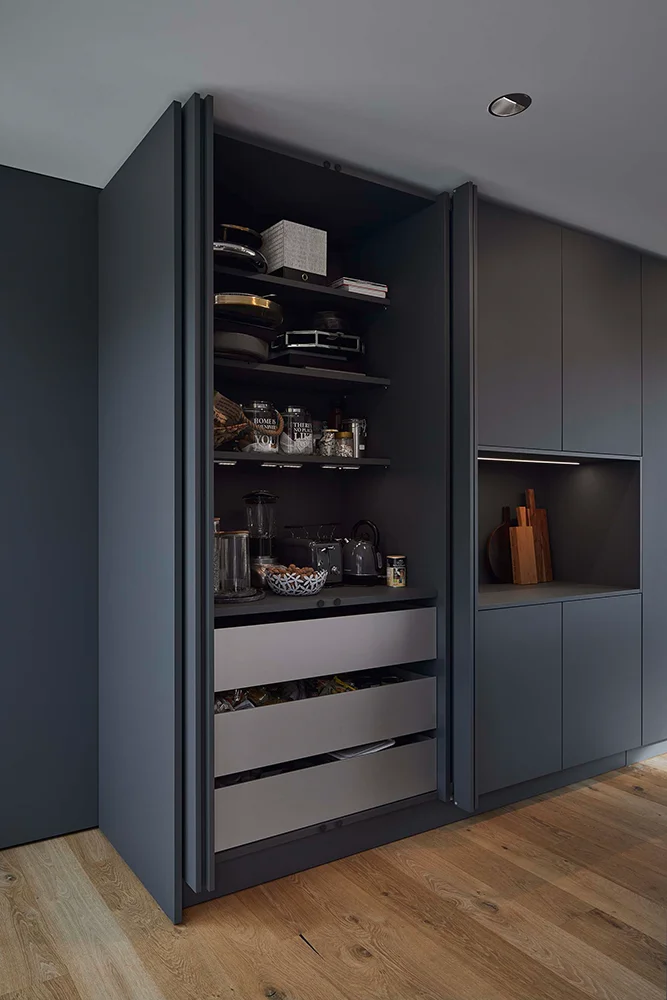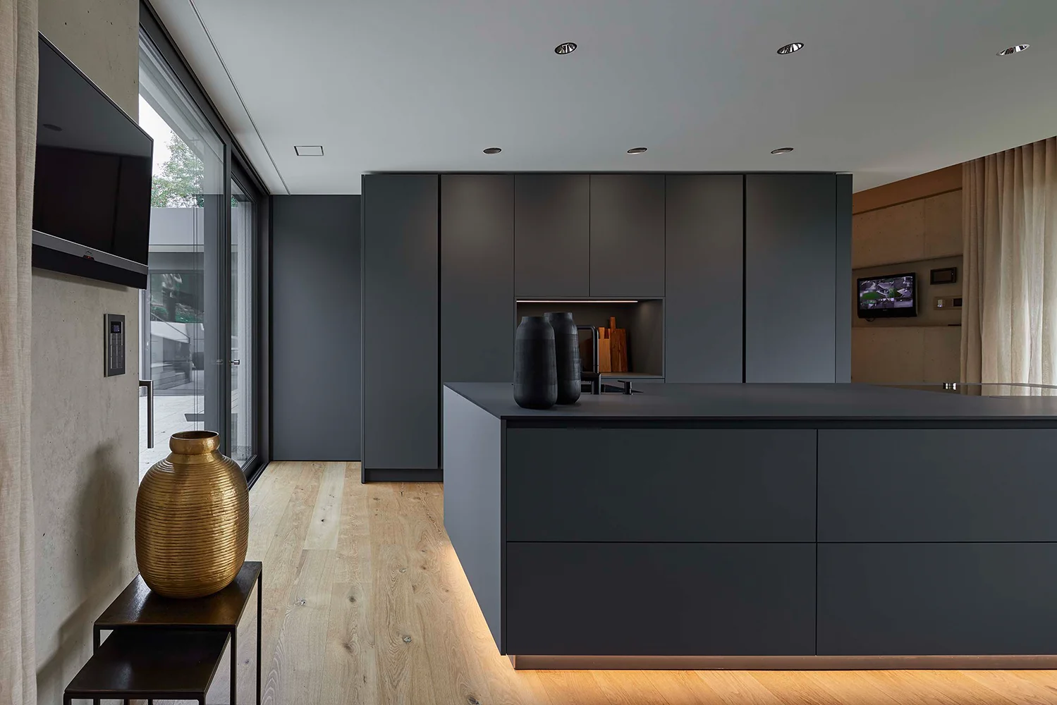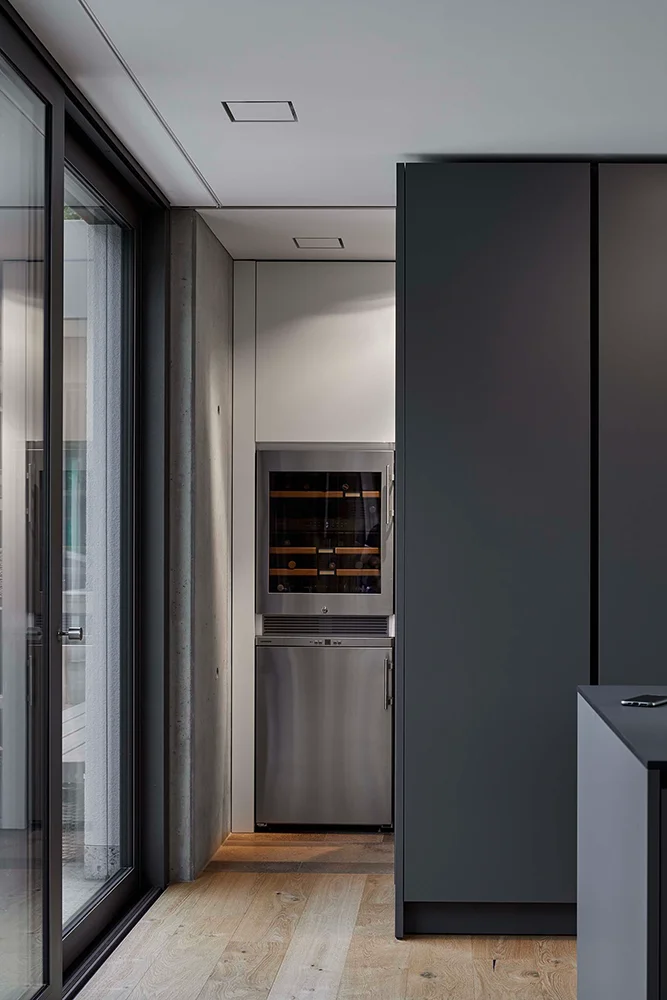 Öffnet man die Einschubtüren der Hochschränke, präsentiert sich eine perfekte Küche – mit Backofen, Dampfgarer, Wärmefach, Arbeitsplatte zum Vorbereiten. Hinter den Einschubtüren dieses „Arbeitsschrank“ kann man die täglichen Dinge des Alltags verstecken und stören nicht im puristischen Gesamtbild.