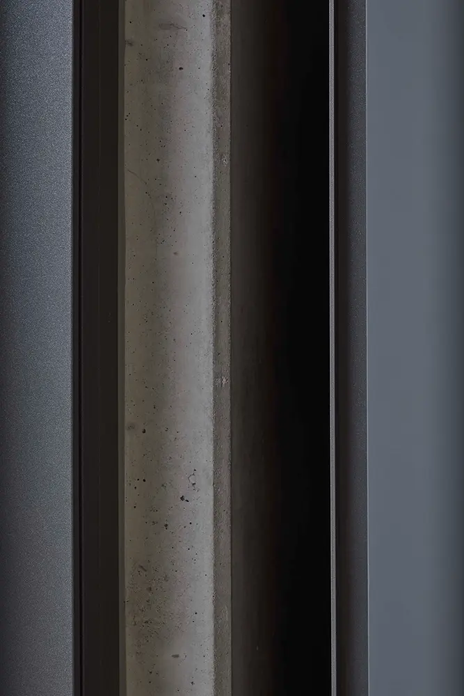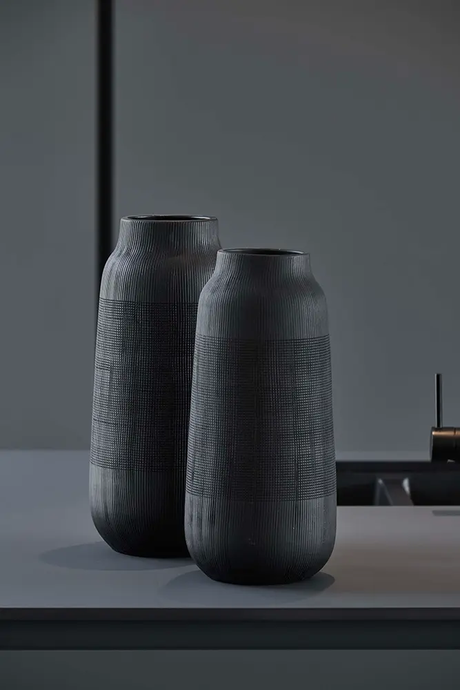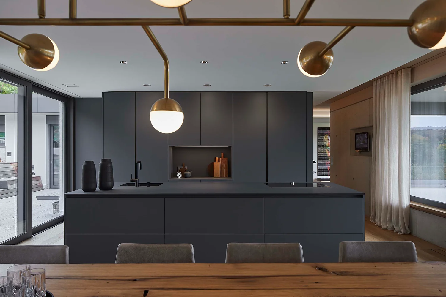 Die Oberflächen wie Fronten, Wangen, Griffleisten,Sockel und die versteckte Schiebetüre sind im selben Material gearbeitet. Das Material ist FENIX Nano GRIGIO BROMO. Die Arbeitsplatte der Insel ist aus dem selben Werkstoff in 12mm Massiv.