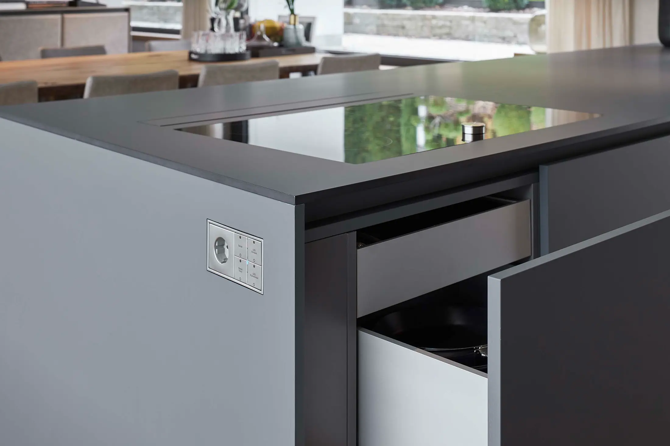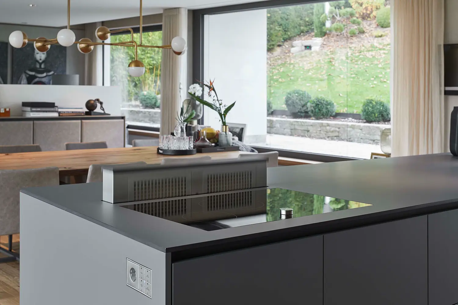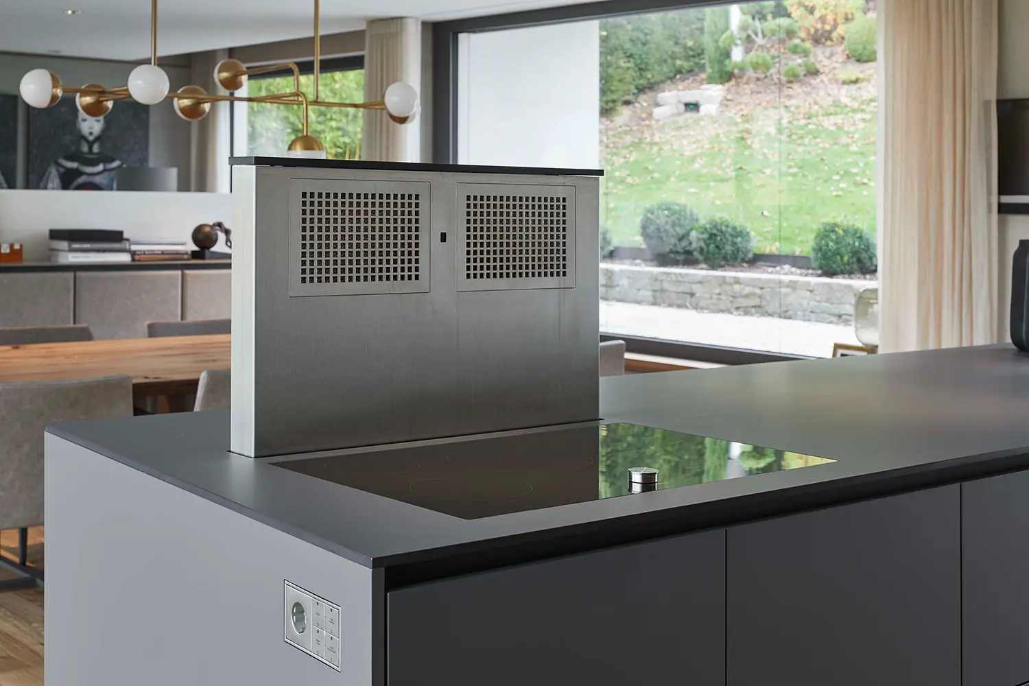 Der Dunstabzug ist in die Arbeitsplatte integriert und fährt bei Bedarf nach oben. Perfektion bis ins kleinste Detail!