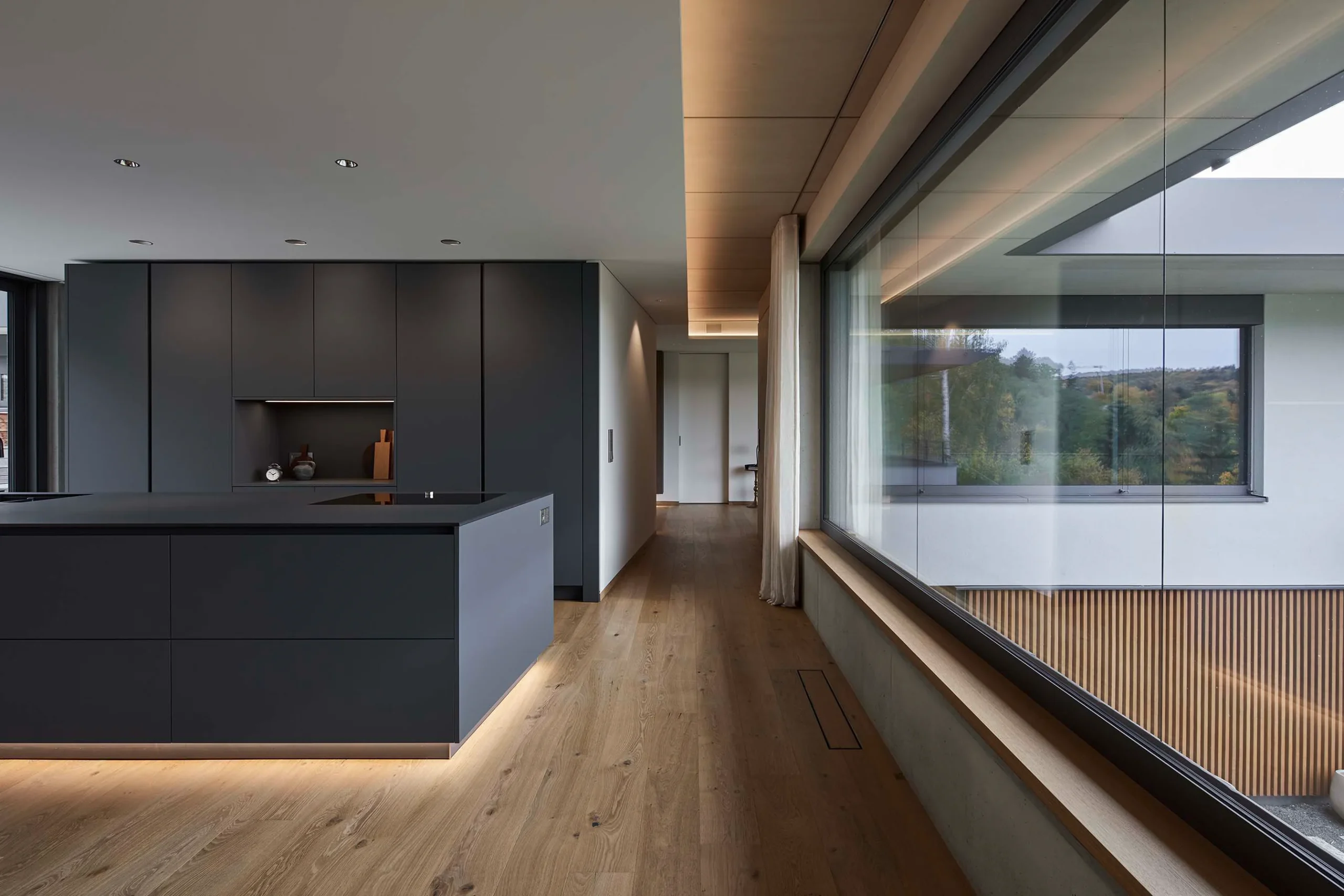 Links neben der Küche ist eine Raumhohe und gedämpfte Schiebetüre die bei Bedarf hinter die Küchenhochschränke geschoben werden kann. Dahinter befindet sich ein zusätzlicher Raum für Vorrat. Der Griff der Schiebetüre wurde von uns speziell in der Fensterfarbe pulverbeschichtet und wirkt bei geschlossener Türe fast unsichtbar.