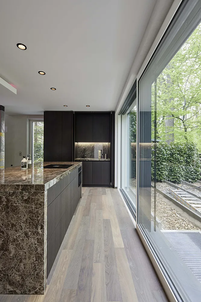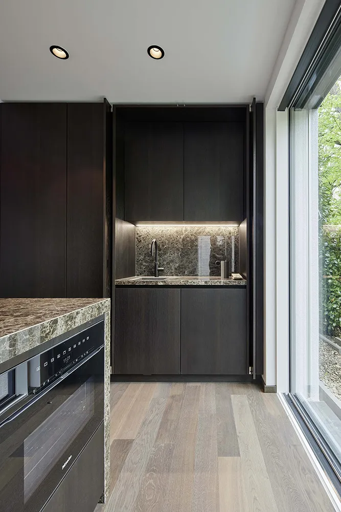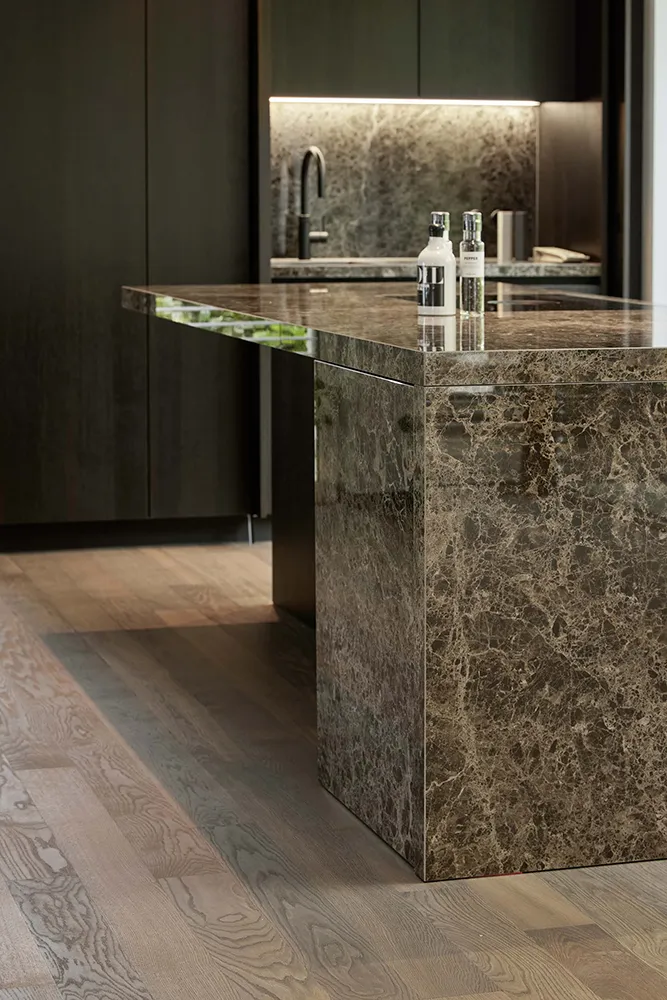 Markante Formen und edle Flächen geben in diesem Raum den Ton an. Die elegante Marmor-Insel sorgt für eine cleane Optik mit verstecktem Stauraum in der komplett grifflosen Küche. Die Spüle mit Quooker-Armatur hat sich ebenfalls in einem Einschubtürenschrank versteckt.