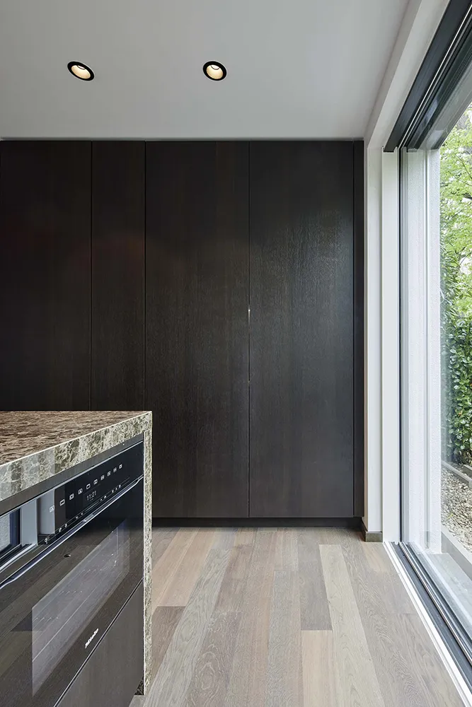 In Verbindung mit der robusten Steinarbeitsplatte und der hochwertig ausgebürsteten Holzoberfläche aus Raucheiche entstand ein schmuckes und ausgetüfteltes Küchenkonzept, bei dem die Technik präzise funktioniert, aber nicht im Vordergrund steht. Die Küche ist mit Geräten von Miele ausgestattet.