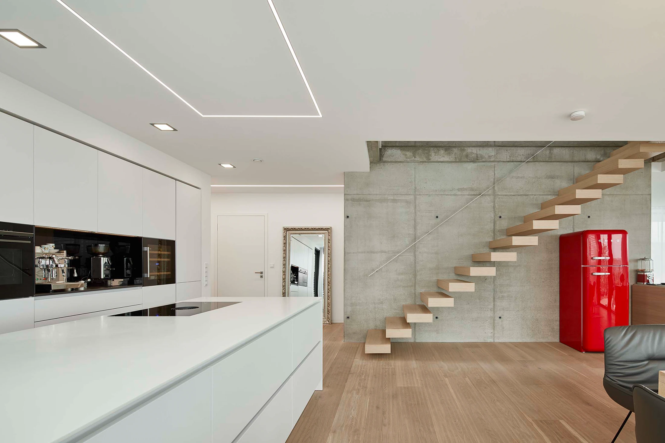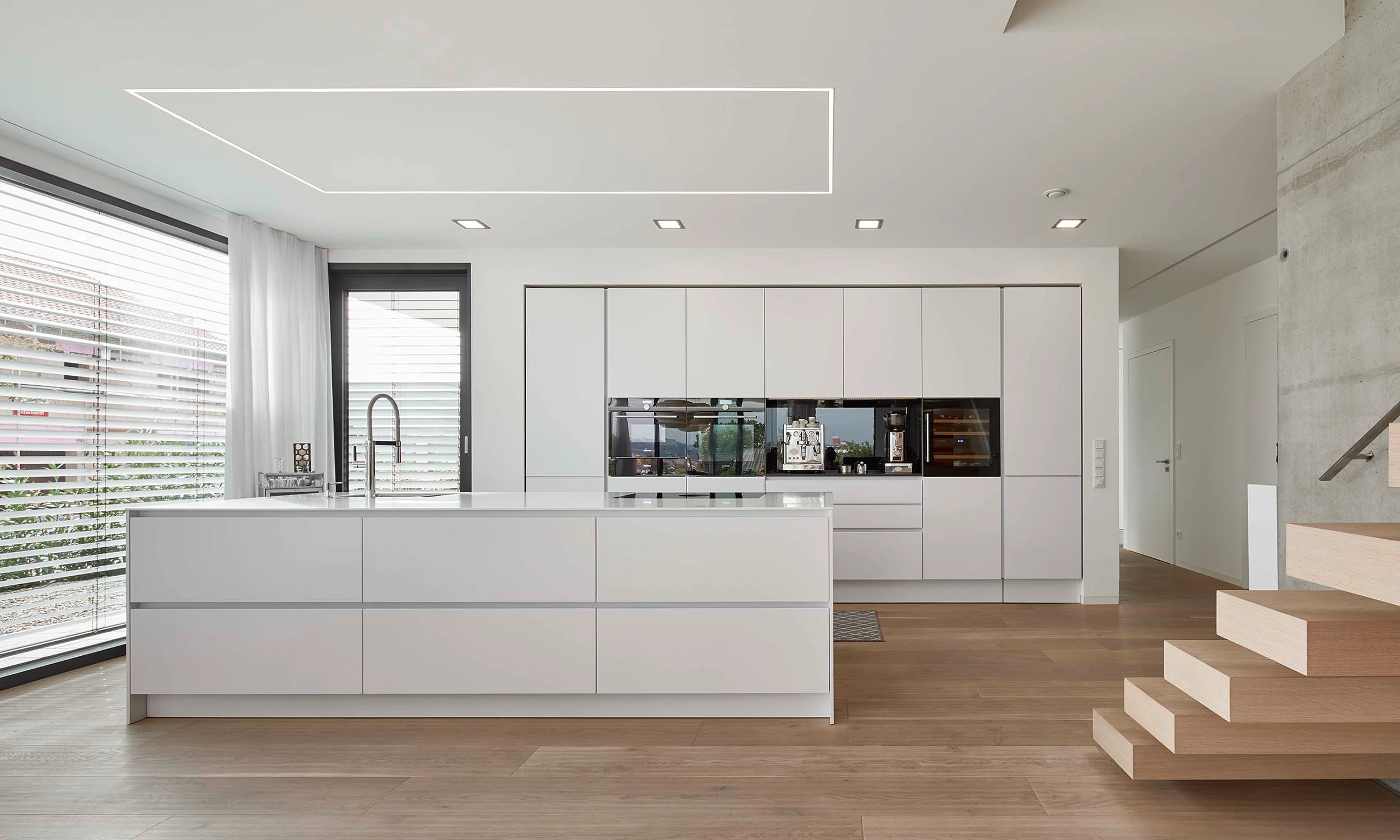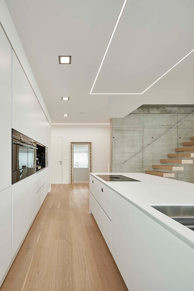 Die Küche fügt sich unaufdringlich elegant in das Gesamtprojekt Lebensraum ein und besticht durch ihre simple, aber effektvolle Gliederung der einzelnen Bereiche innerhalb des offenen Wohnkonzepts. Die lineare Anordnung der hochwertigen Geräte, ist nicht nur funktional, sondern dient auch hinsichtlich dem gestalterischen Layout als Stilmittel. Der als Hochschrank getarnte Zugang zur Vorratskammer ist ein weiteres Highlight, das Design und Praktikabilität vereint.