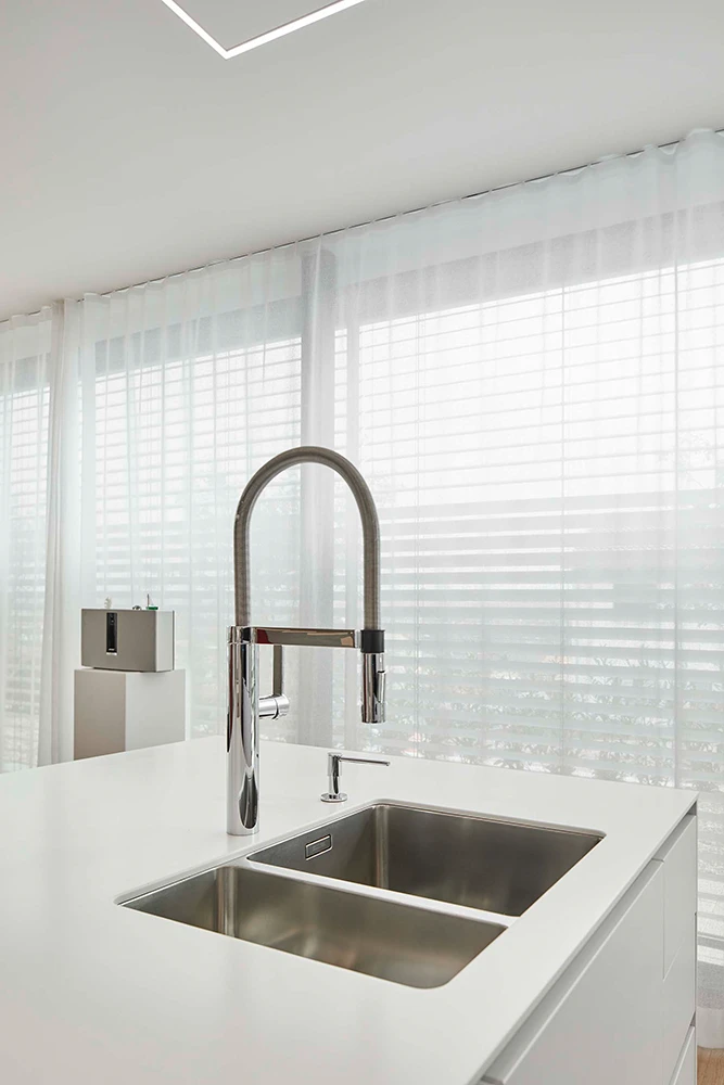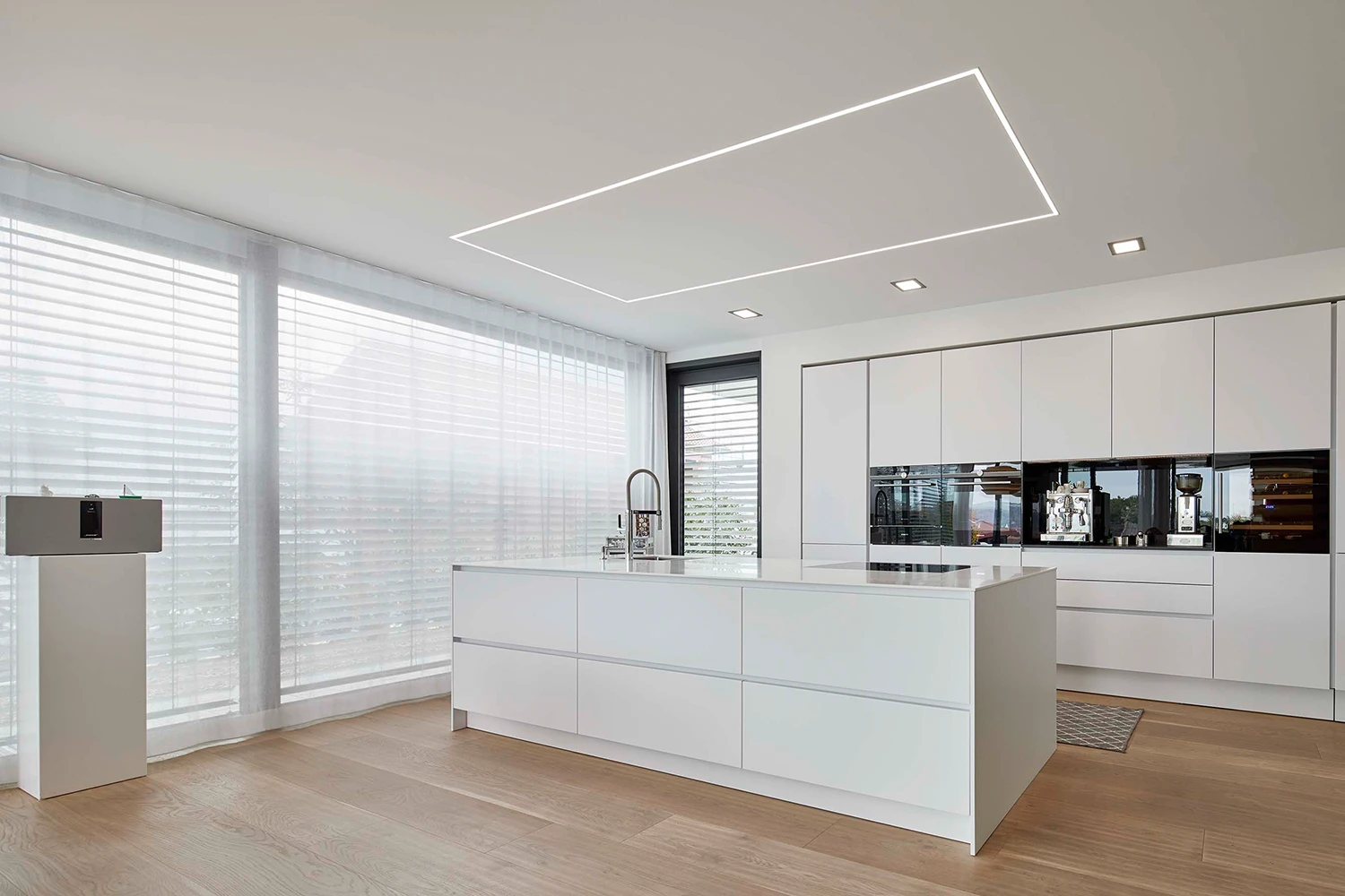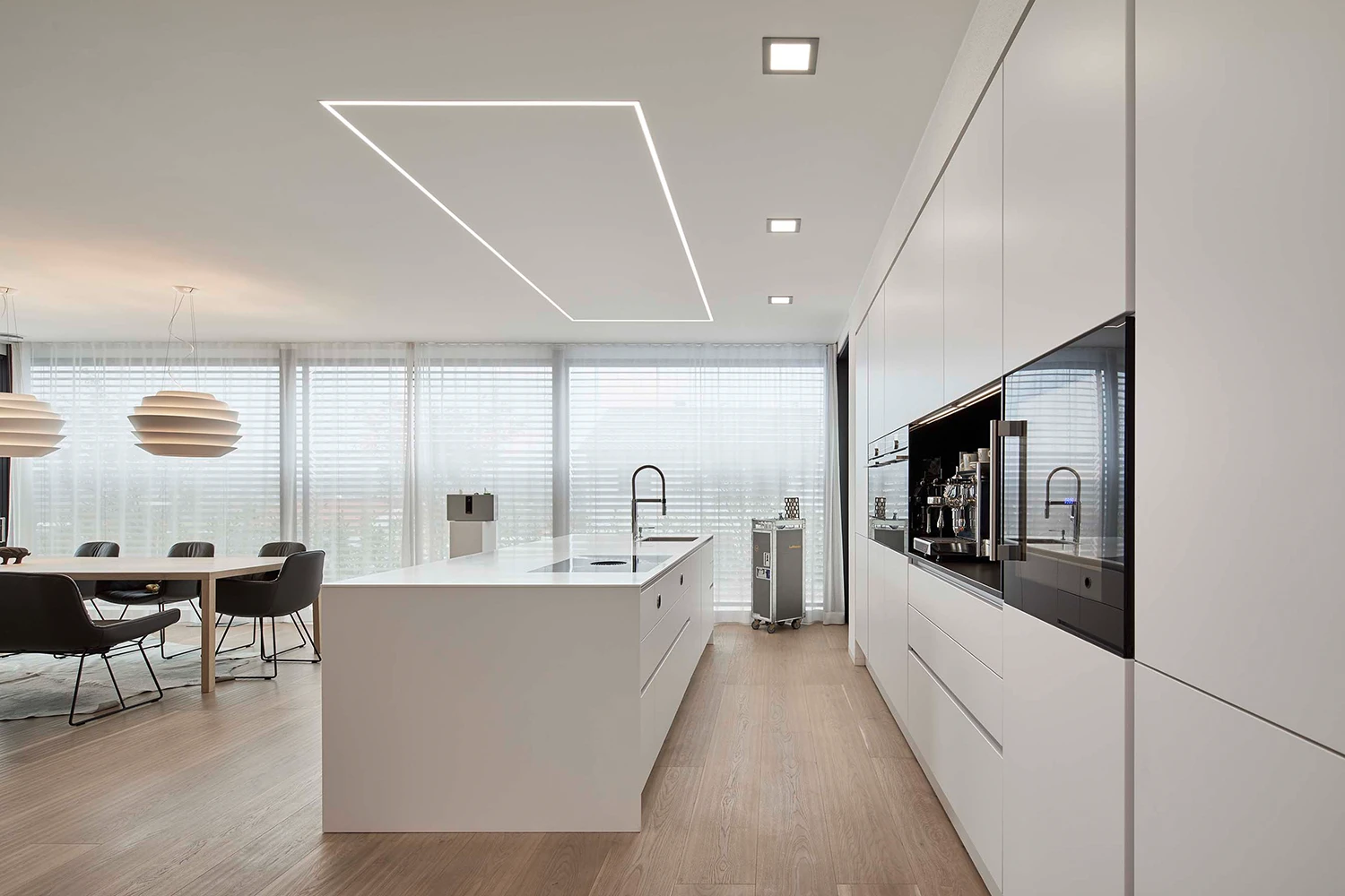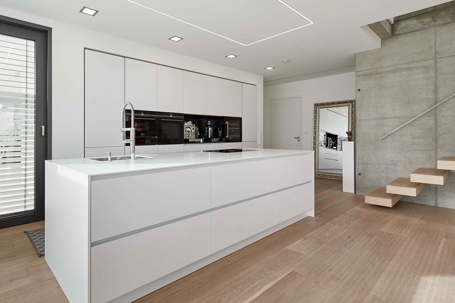 Die Küche fügt sich unaufdringlich elegant in das Gesamtprojekt Lebensraum ein und besticht durch ihre simple, aber effektvolle Gliederung der einzelnen Bereiche innerhalb des offenen Wohnkonzepts. Die lineare Anordnung der hochwertigen Geräte, ist nicht nur funktional, sondern dient auch hinsichtlich dem gestalterischen Layout als Stilmittel. Der als Hochschrank getarnte Zugang zur Vorratskammer ist ein weiteres Highlight, das Design und Praktikabilität vereint.