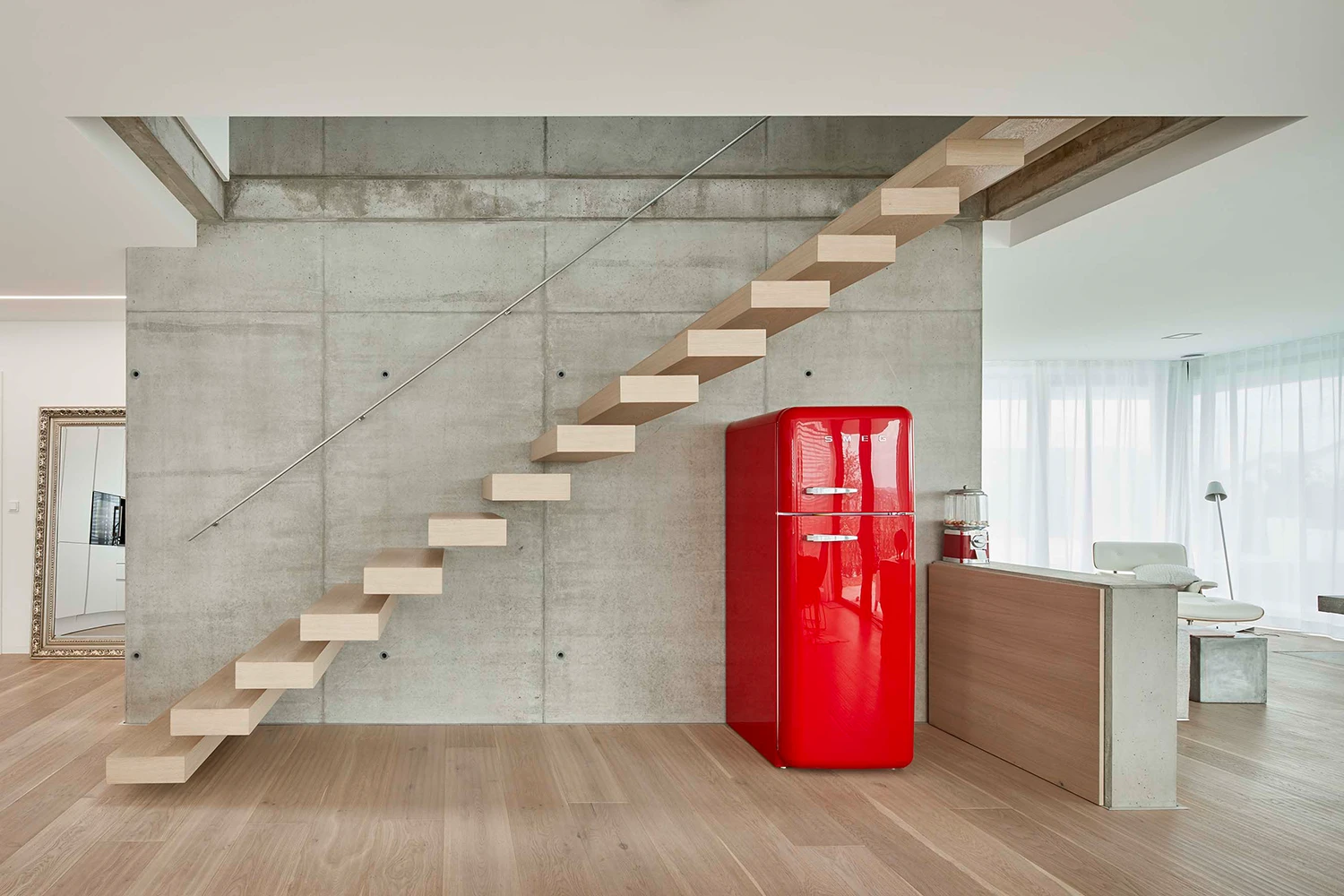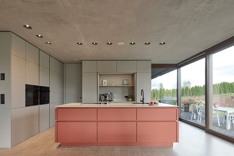 Diese helle Wohnküche verbindet mühelos zeitlose Eleganz mit praktischer Funktionalität und schafft so einen Raum, der sowohl ästhetisch ansprechend als auch nutzungsfreundlich ist. Die klaren Linien und die subtile Lichtsignatur sorgen für eine einzigartige Leichtigkeit, die durch die Kombination der Werkstoffe Holz und Beton noch verstärkt wird.