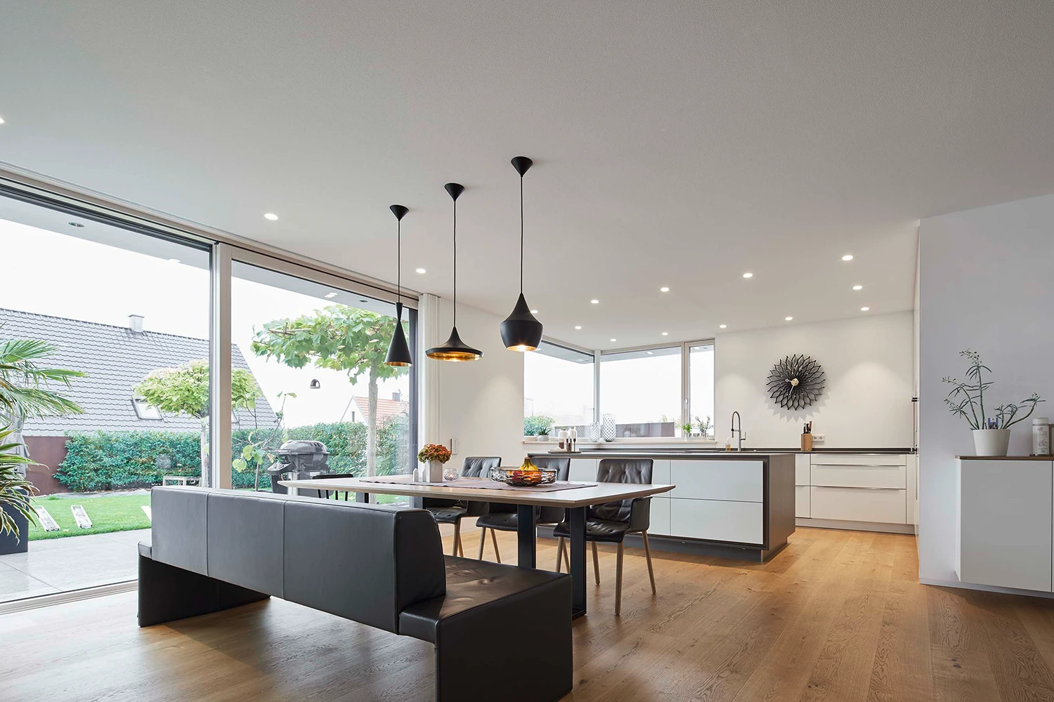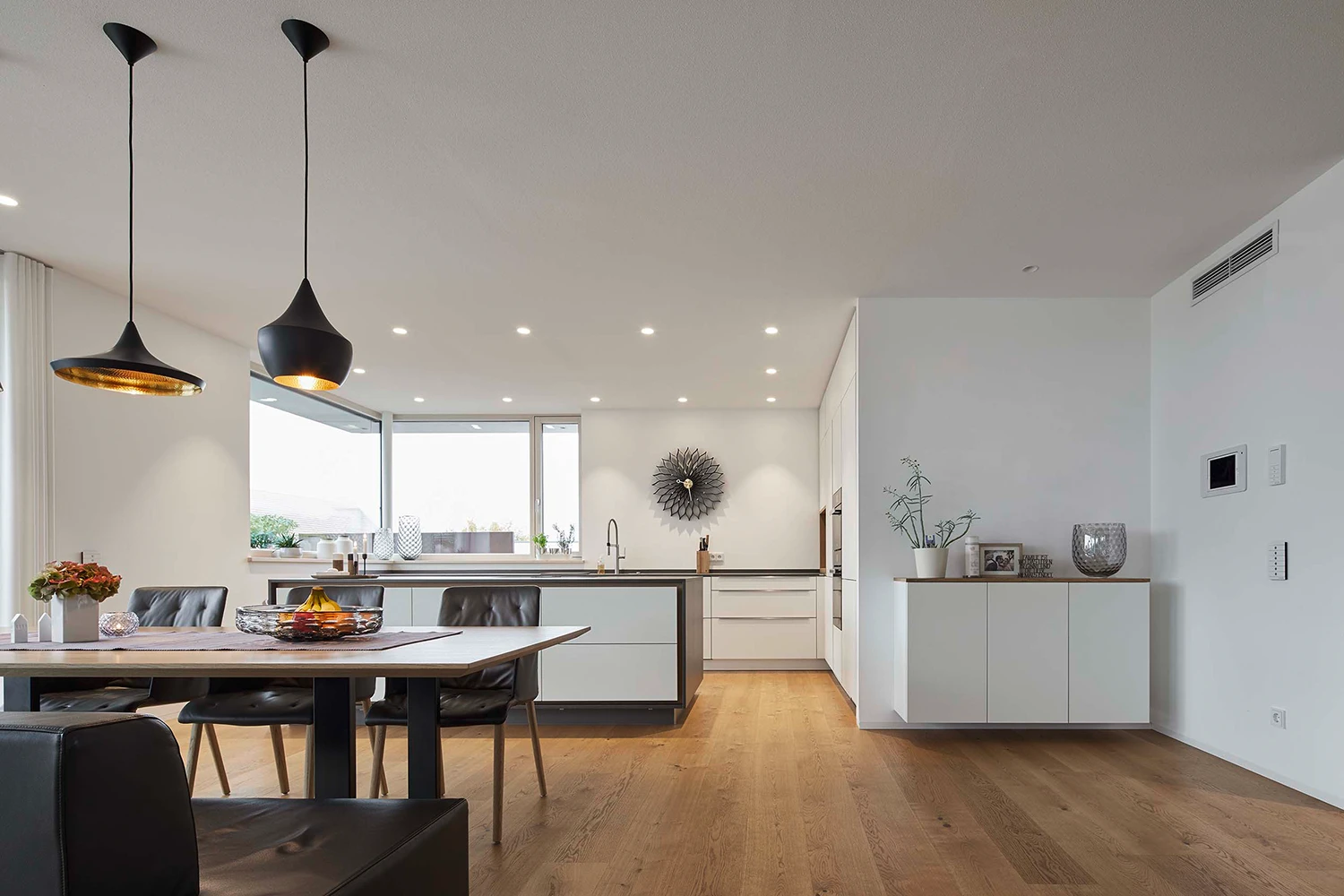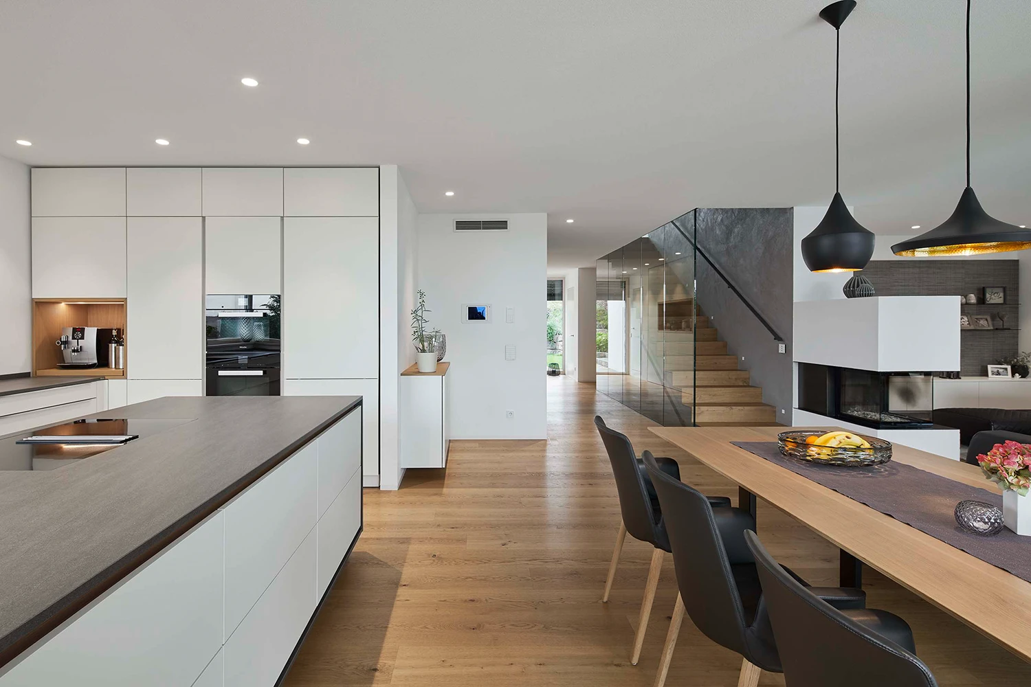 Der neue Lieblingsplatz kommt modern und schnörkellos daher und besticht durch seine unprätentiöse Eleganz. Hier verbindet sich auf zeitlose Art Küche, Essen und Wohnen.