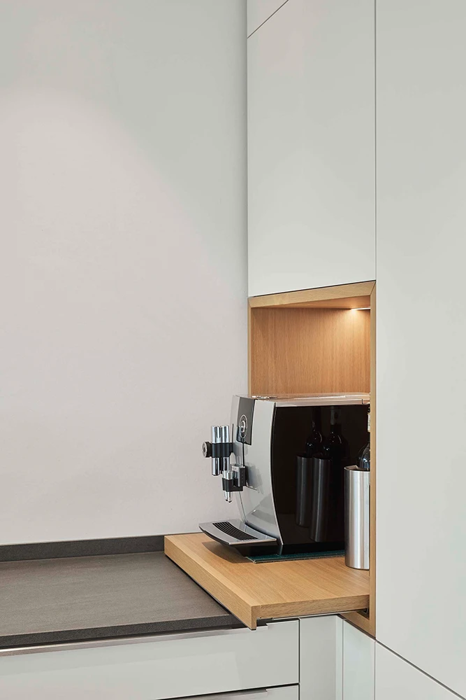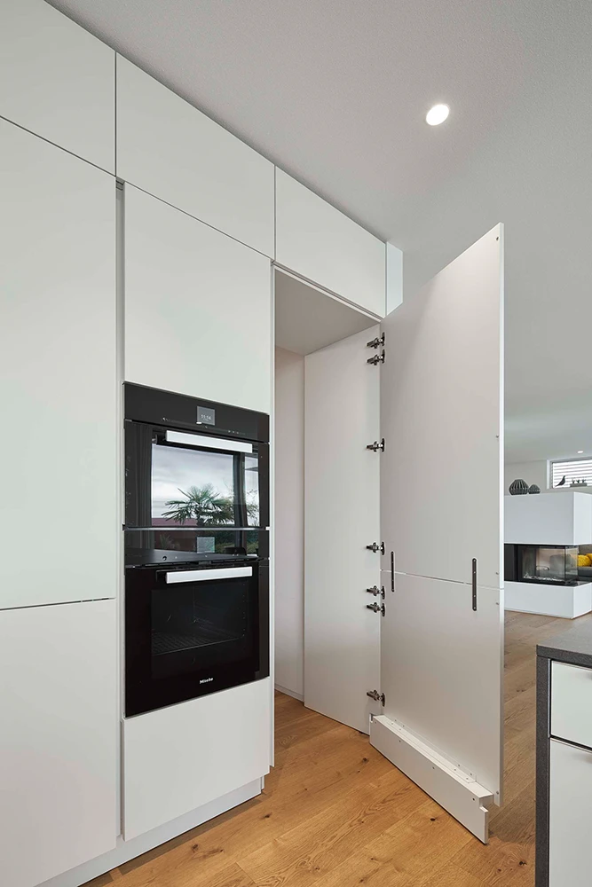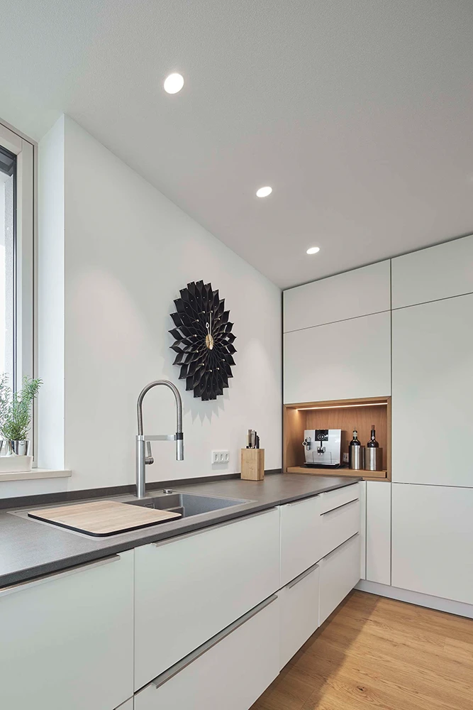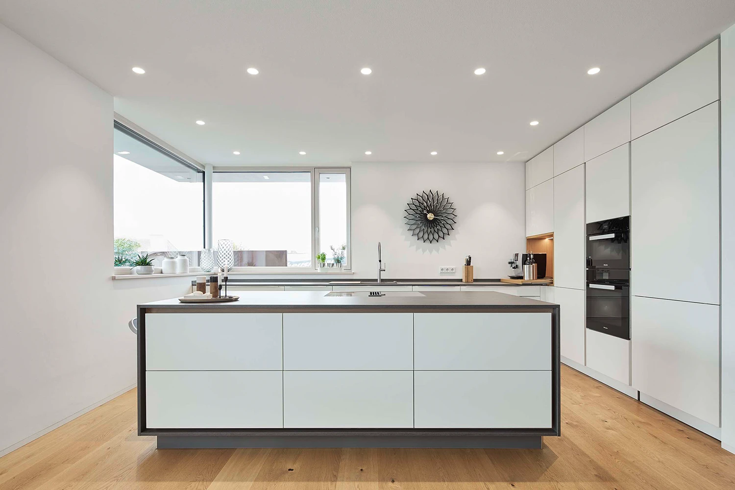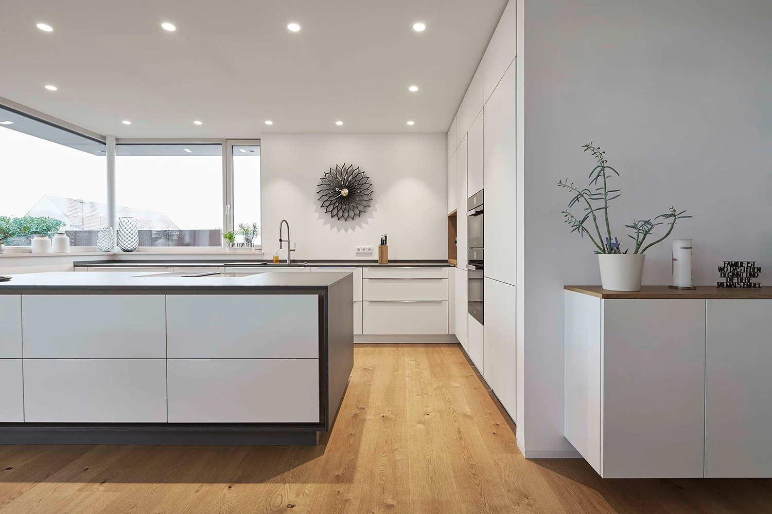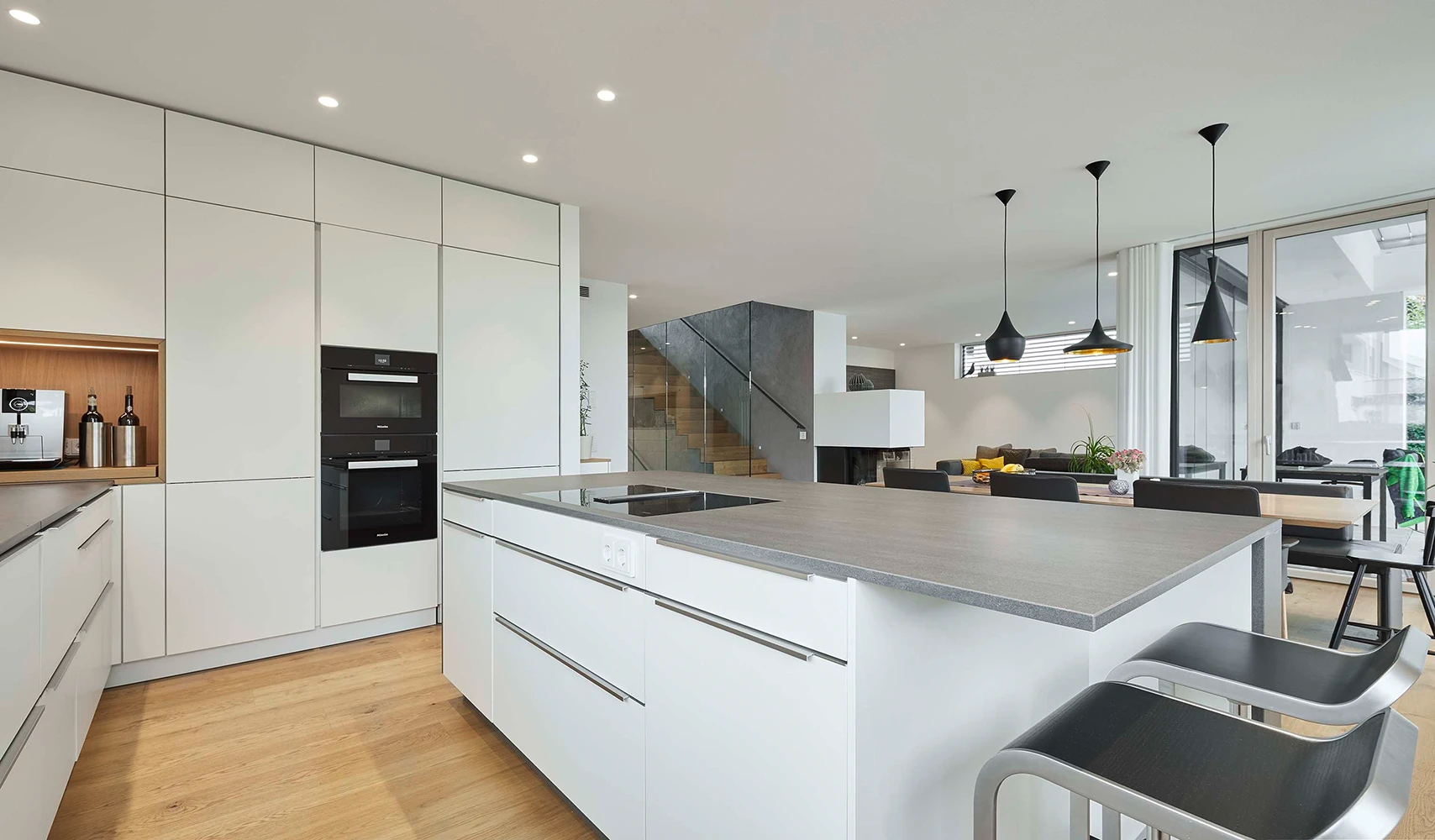 Klare Linien, durchdachte Strukturen und ein Auftritt nach Maß: Wenn die Küche zum ganz persönlichen und sehr individuellen Wohlfühlort wird. Die pflegeleichte, mattweiße Küche mit grauen Arbeitsflächen und grauen Griffen fügt sich harmonisch in den Wohnbereich ein und avanciert dadurch zu einem gemütlichen Familienzimmer, einem Ort, an dem man sich gerne mit Familie und Freunden zum leckeren (gemeinsamen) Kochen und Essen trifft.