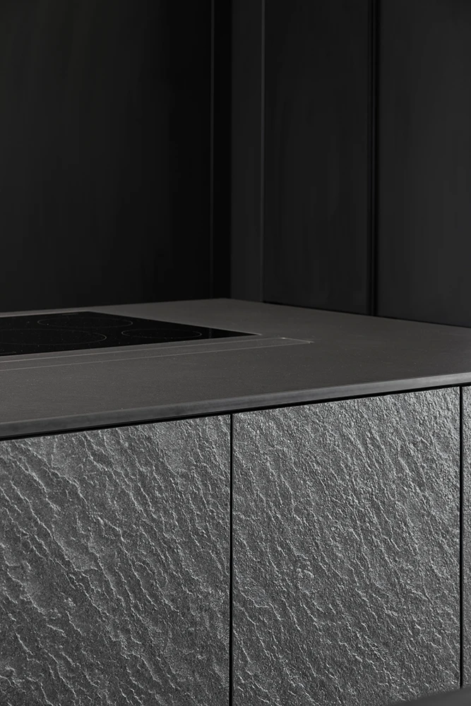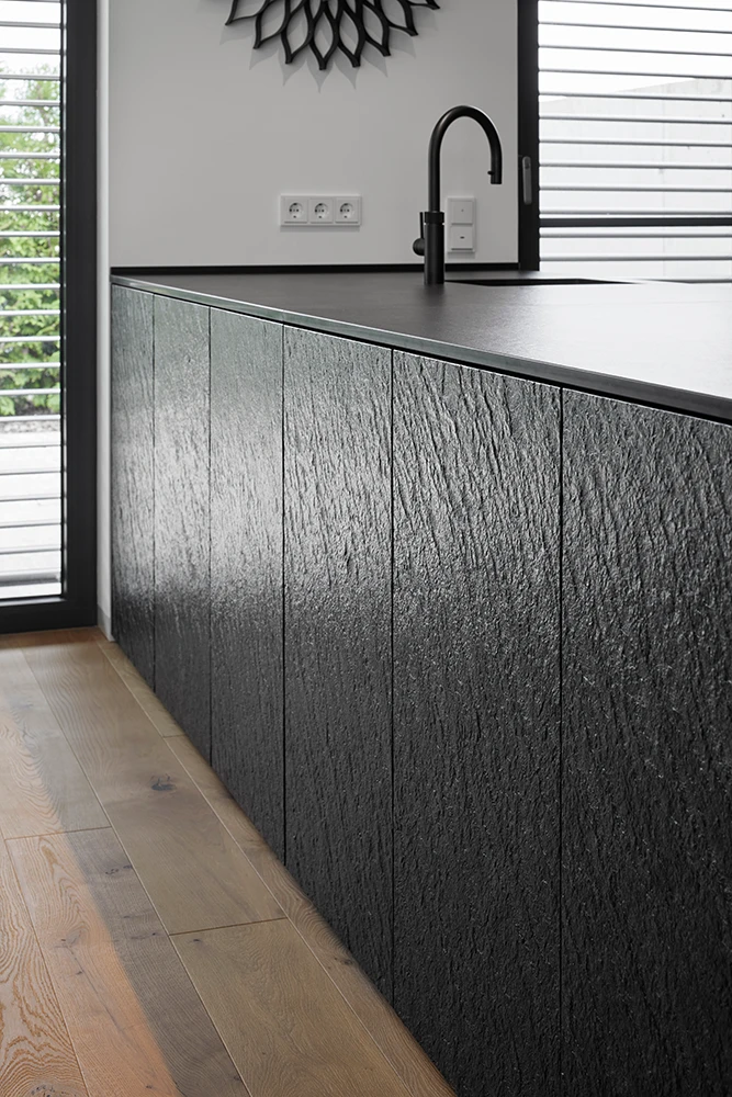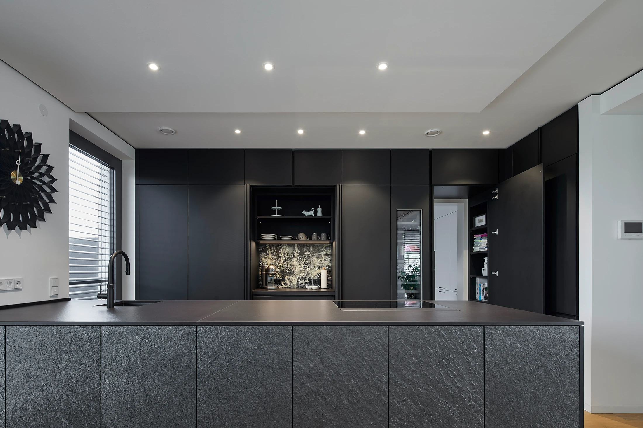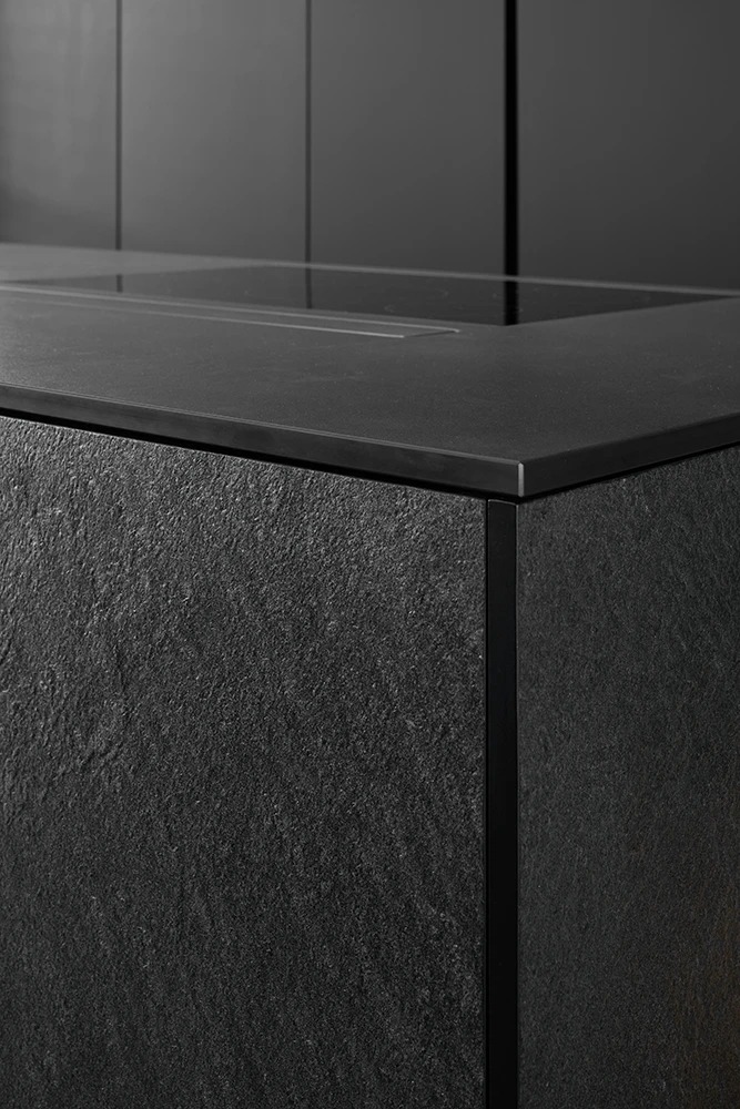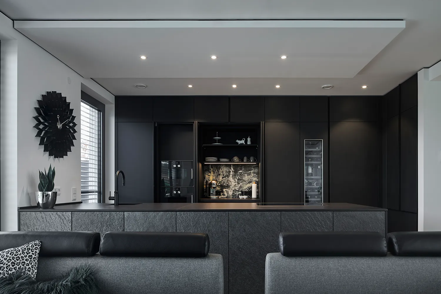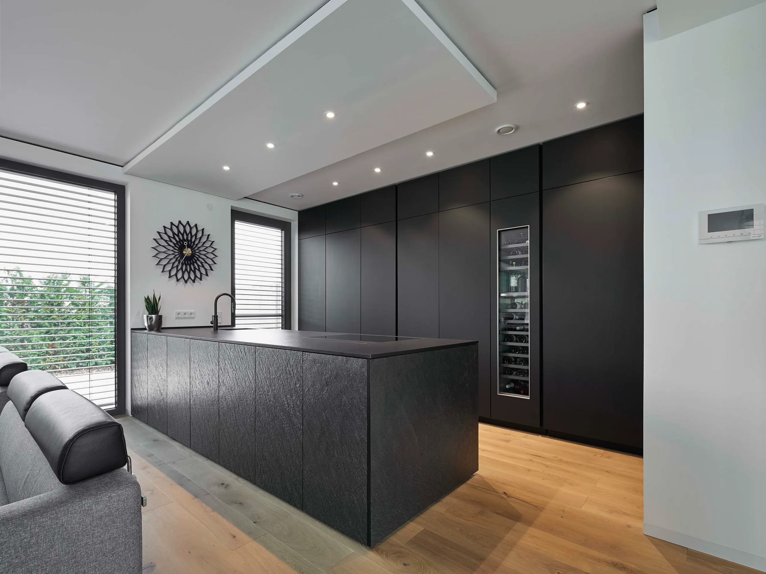 Diese Küche wird auch Ihr Herz erwärmen. Hier hat alles seinen Platz: wenn die Top-Geräte nicht im Einsatz sind, verschwinden Sie hinter der nanobeschichteten Front. Der Küchenblock setzt mit der Schieferfront einen besonderen Akzent.