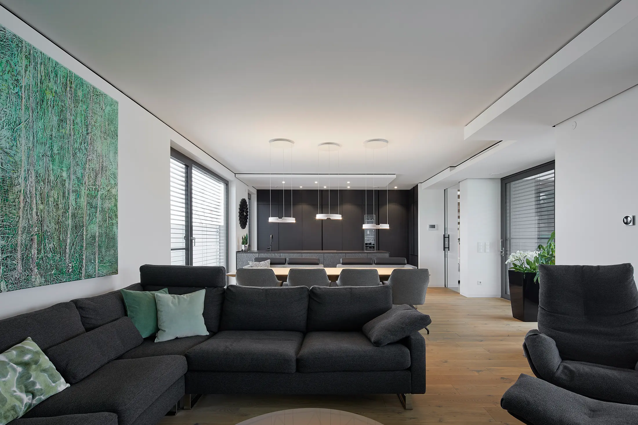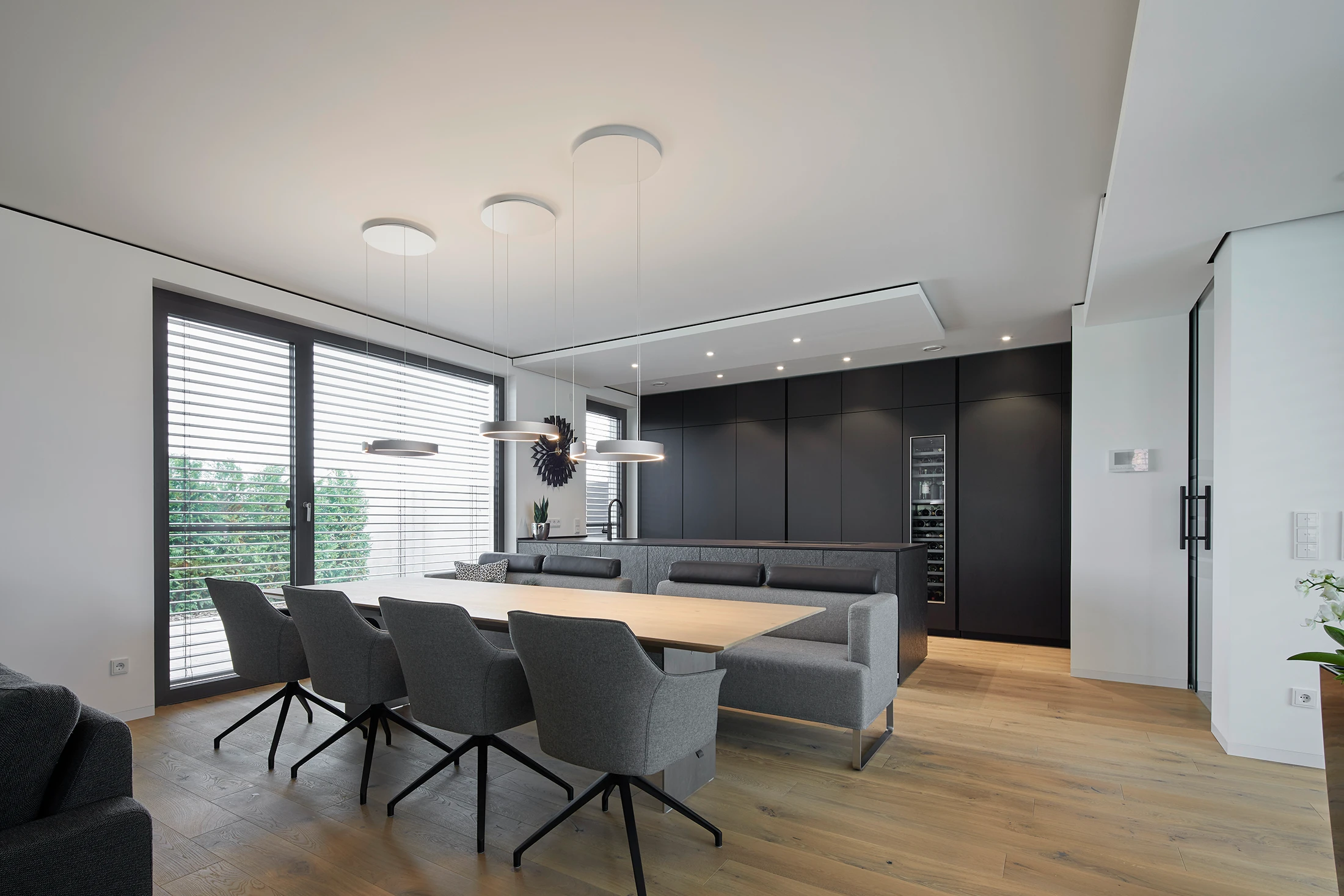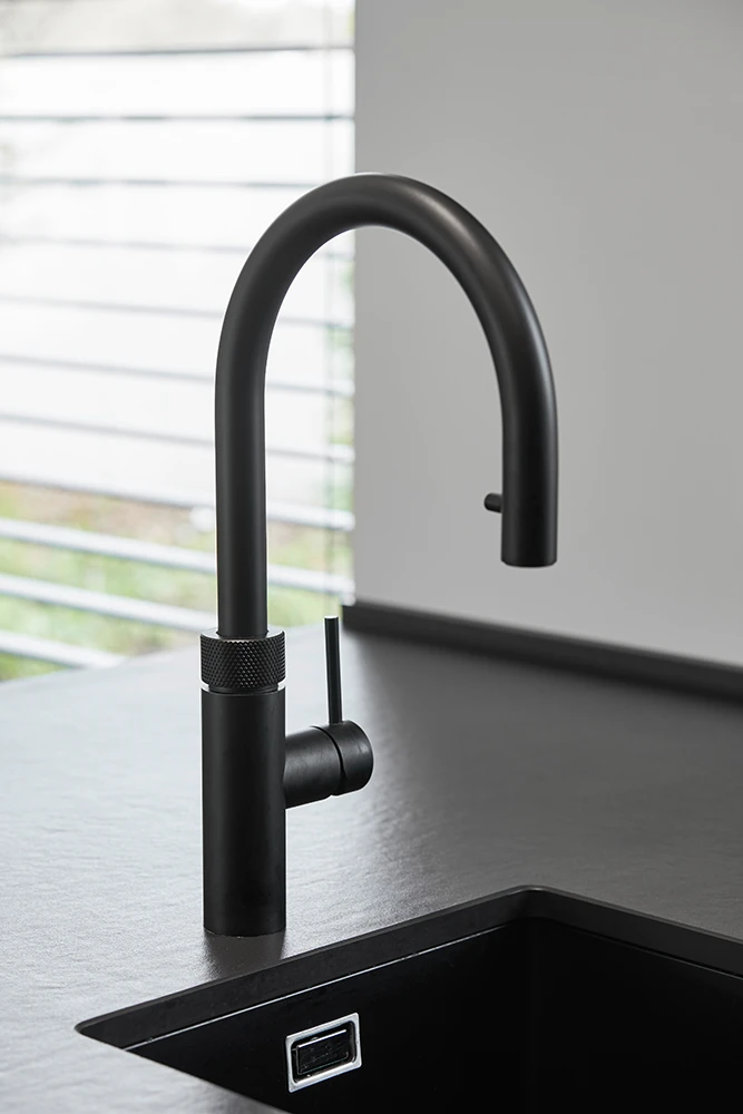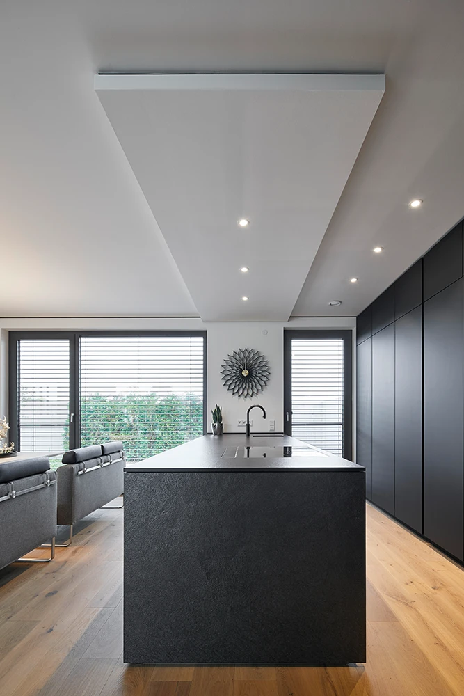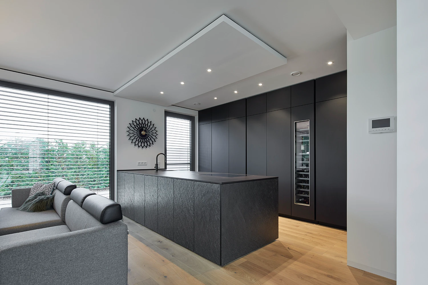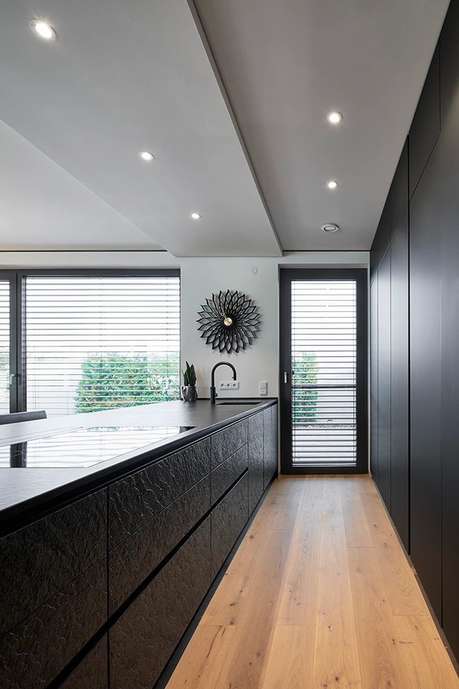 Diese Küche wird auch Ihr Herz erwärmen. Hier hat alles seinen Platz: wenn die Top-Geräte nicht im Einsatz sind, verschwinden Sie hinter der nanobeschichteten Front. Der Küchenblock setzt mit der Schieferfront einen besonderen Akzent.