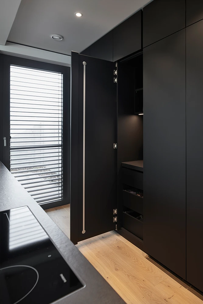 Durch die versteckte Türe in der Hochschrankfront gelangt man in die dahinterliegende Schmutzküche.
